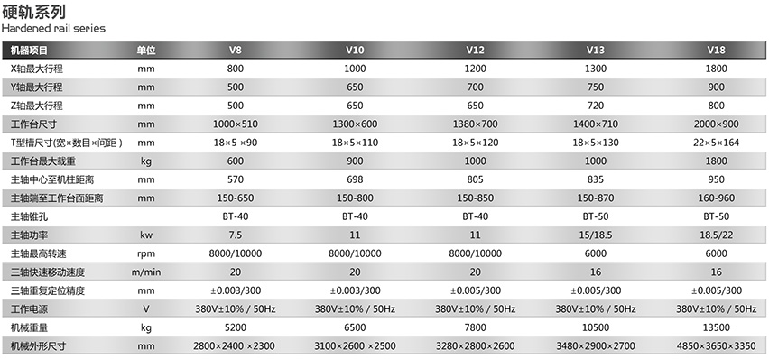 標準配置 1.三軸采用壹灣"銀泰PMI"滾珠絲桿 2.三軸采用日本"NSK"軸承 3.三軸采用壹灣"BNS"限位開關 4.三軸采用德國R+W彈性聯軸器 5、主軸冷卻系統 6、主軸錐孔清潔吹氣 7、分離式手輪三色警示燈 8、防爆工作燈 9、電氣箱熱交換器 10、中央集中自動進給潤滑系統 11、 油水分離裝置 12、地基墊塊及調整螺栓 13、工具箱 14、操作手冊及控制電路數據 | 選購配置 1.斗笠式刀庫、圓盤式刀庫 2.第四軸聯動分度盤 3.螺旋式、鏈條式鐵屑輸送機 4.日本三菱M70A、B控制系統 5.日本發那科0iMD、0iMC |